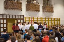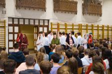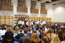 A tornateremben az egész gimnázium megnézte Molnár György tanár úr rendezésében a 11. d osztály frappáns, pörgős, a megszokott elemeket teljesen mellőző, alapvetően az érzékszervekre és érzelmekre ható drámapedagógiai elemekre építő műsorát. Majd osztályonként felkerestünk két-két budapesti emlékhelyet. Ezek egyike a forradalomhoz, a másik a szabadságharchoz kapcsolódott. Az egyik Pesten volt, a másik Budán, és az egyik ismertebb, a másik rejtettebb volt. Így volt akik a Pilvax kávéház (helyét) keresték fel, voltak a Batthyány örökmécset, míg mások Görgei szobrát. De az iskola közelében lévő emlékekhez is eljutottunk: Tóth Ágoston emléktáblájához, Gábor Áron sajátos alakú emlékművéhez, vagy Kovács J. honvéd sírjához.
