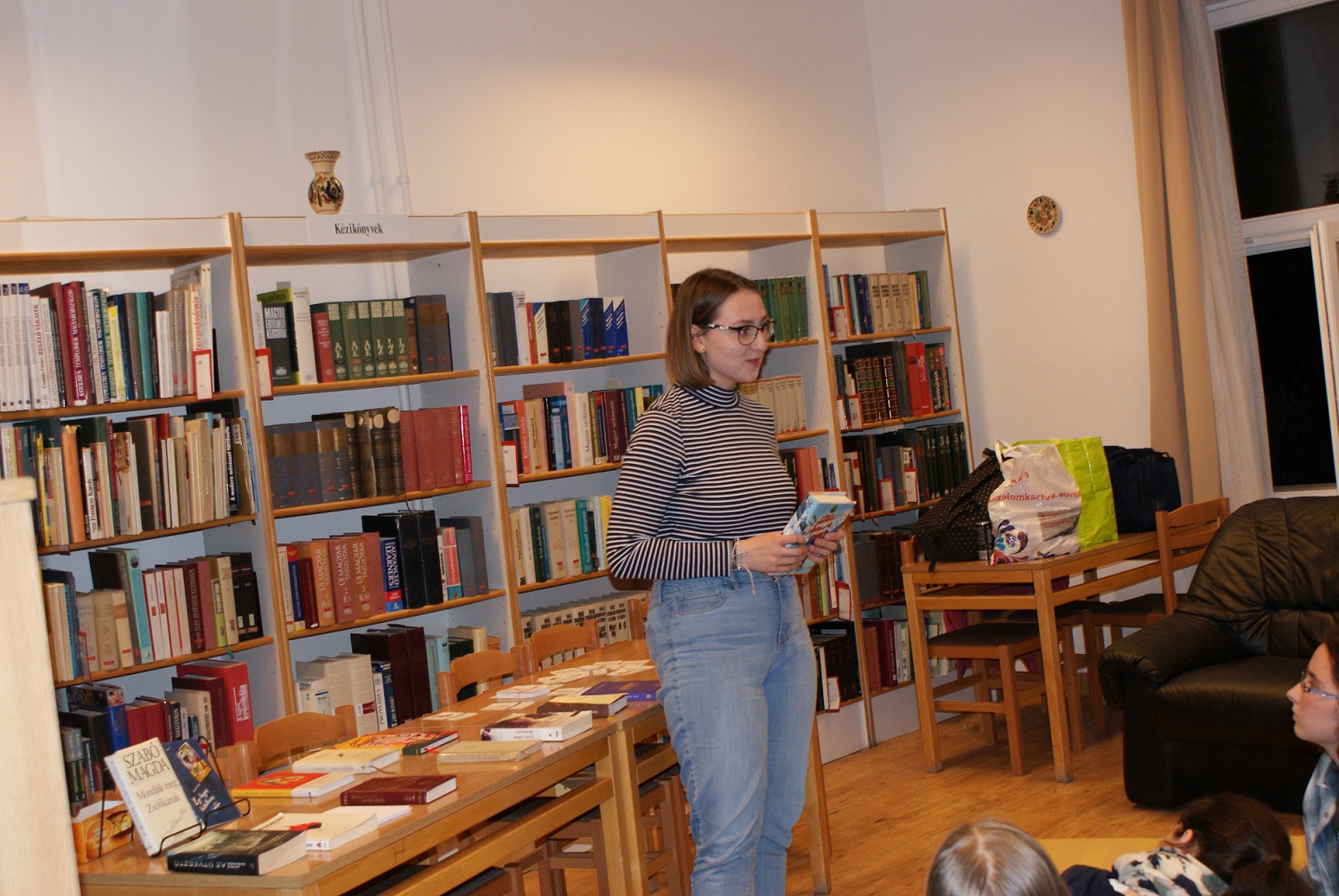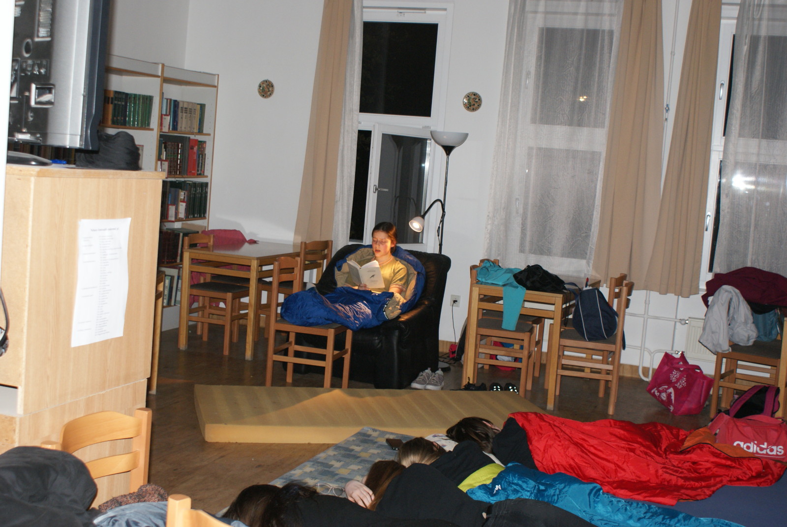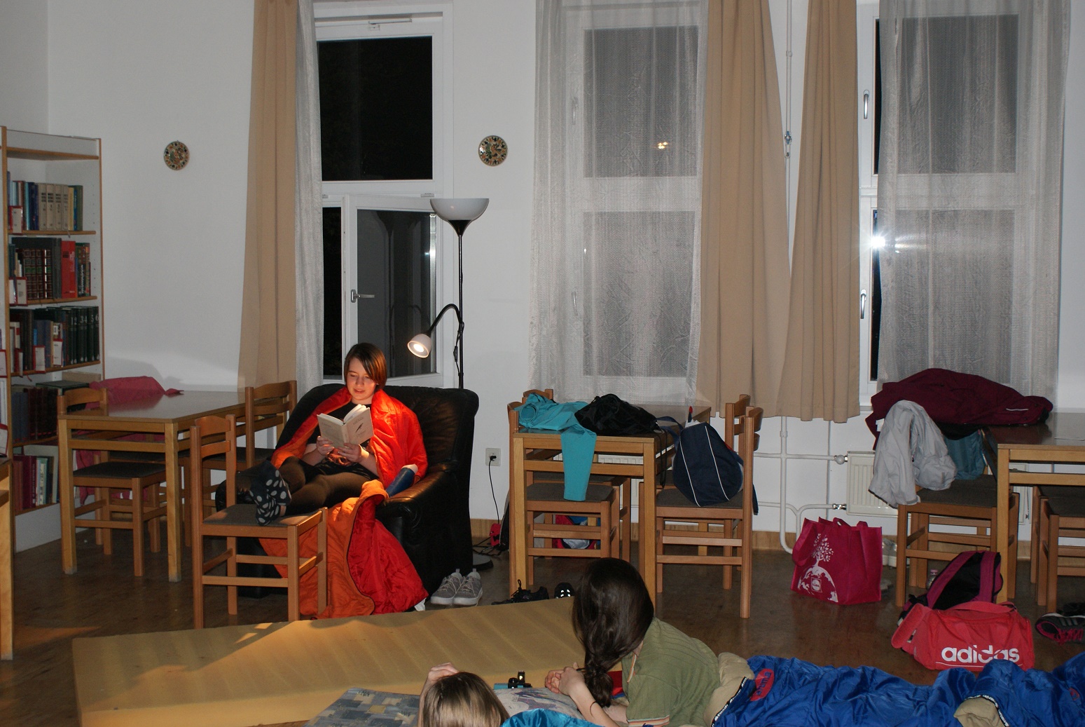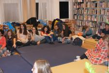 Pénteken 25 elszánt olvasni szerető ember arra szövetkezett, hogy egy különleges éjszakát töltsön együtt a könyvtárban. Néhányan már harmadik alkalommal, egészen sokan másodszor és tízen először vetették be magukat a szivacsokkal bélelt olvasóterembe. Hálózsákkal, kispárnával és egy ajánlandó könyvvel a kezükben érkeztek és széles jókedvvel a lelkükben. Bizonyosak voltak abban, hogy az a hely, ahová naponta nem mindig szívesen látogatnak, napnyugtakor a barátságosabb arcával fordul feléjük. Ismerkedő kör, ajánlások, szavazás és pizza. Hangtalan bolyongás eloltott lámpák mellett a folyosón. Felszabadult, légies balett mozdulatok a sötétben, természetesen zokniban és ijesztgetés… Végül hajnalig tartó olvasás. Szóval minden a megszokottak szerint…