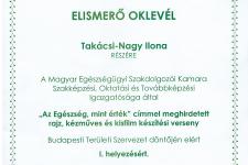 "Az egészség , mint érték" fővárosi képzőművészeti pályázat II. helyezett lett Bajor Kata 9.c Minden nap egy alma, az orvost távol tartja műve.